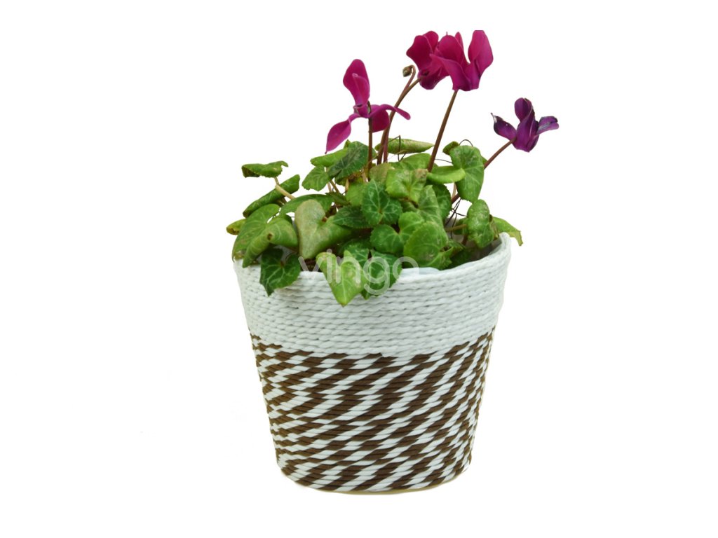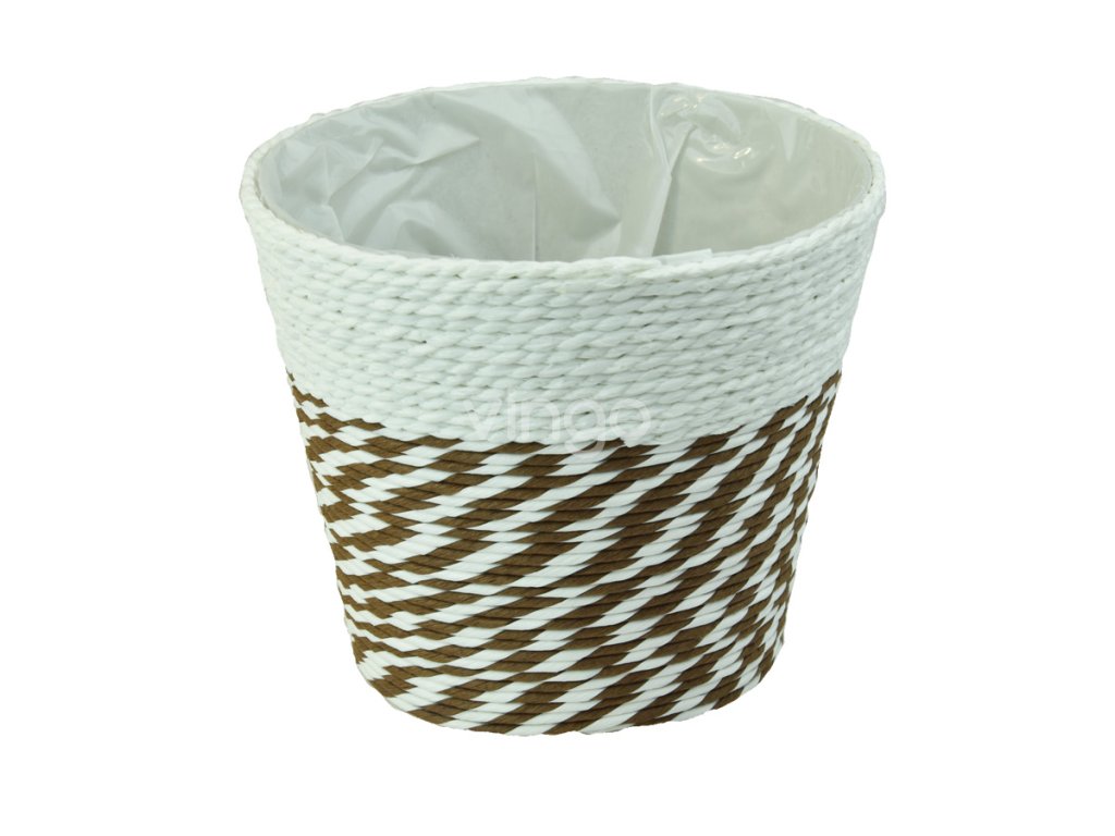 A kétszínű fehér és barna virágcserép zsinegből készült. Két méret (cm) közül választhat, hogy az ültetőgép illeszkedjen a virághoz. Belseje műanyag betéttel bélelt.Termékinformáció: