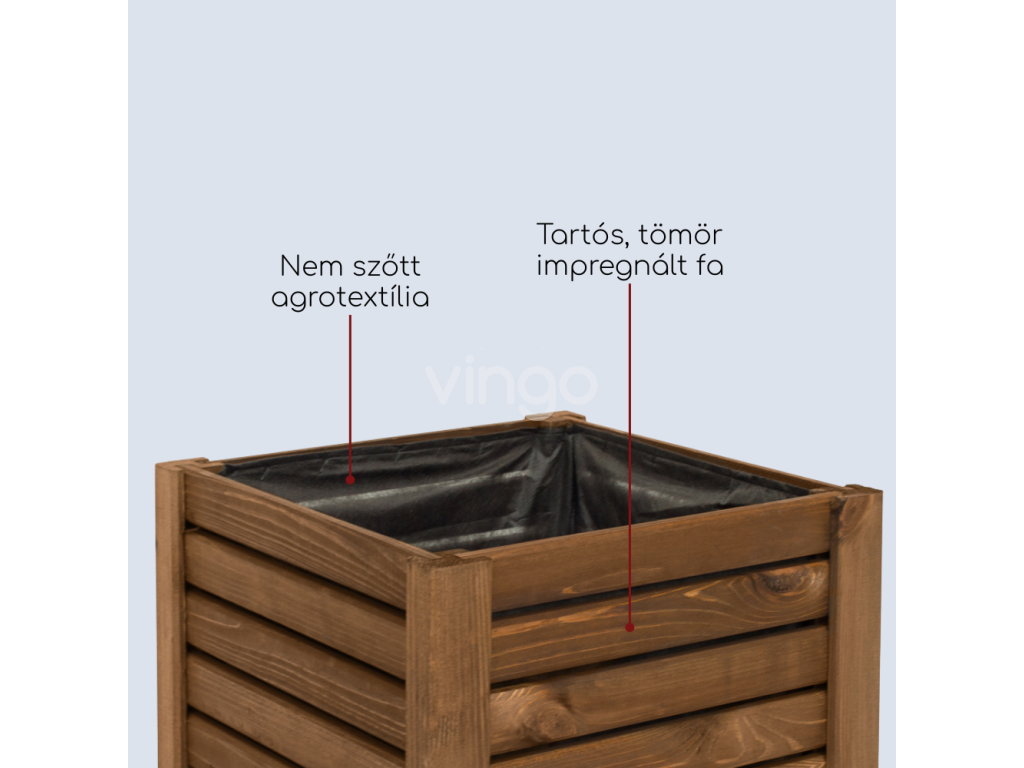 - Minőség: A virágcserép gyártásához tömör, strapabíró fát használtak, aminek köszönhetően ellenáll a különféle időjárási viszonyoknak, például nedvességnek, fagynak és UV-sugárzásnak.