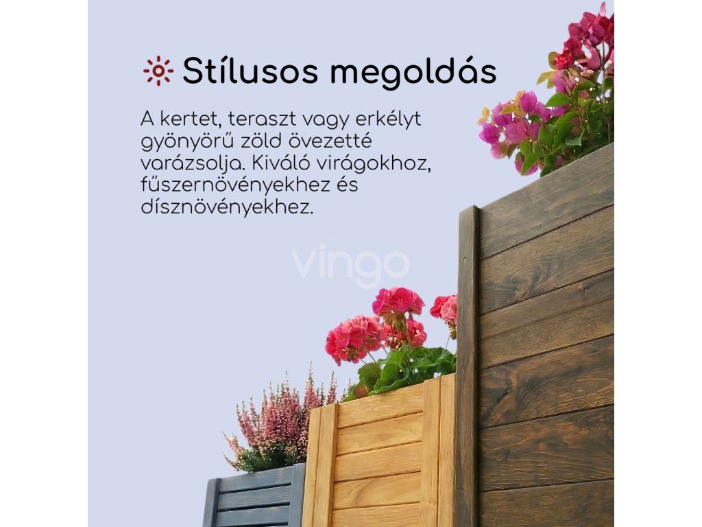- Elegáns: Minden lábas fa doboz a terasz, a kert és az erkély dísze lesz. A praktikus, egyszerű forma, a sötétbarna szín és az elegáns kivitel, a látható fa erezetével gyönyörű dizájntartozékká teszik az ültetőgépet.