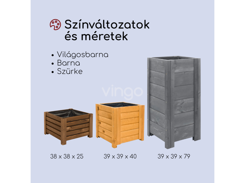 - Minőség: A virágcserép gyártásához tömör, strapabíró fát használtak, aminek köszönhetően ellenáll a különféle időjárási viszonyoknak, például nedvességnek, fagynak és UV-sugárzásnak.