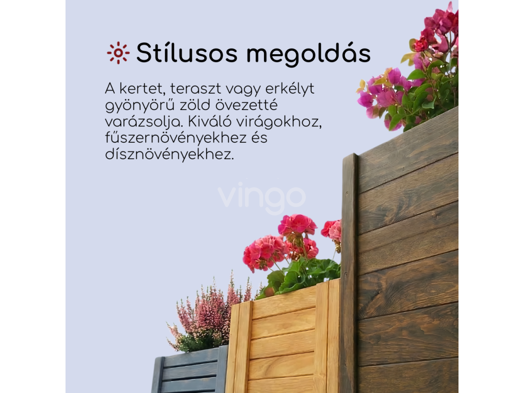 - Elegáns: Minden lábas fa doboz a terasz, a kert és az erkély dísze lesz. A praktikus, egyszerű forma, a sötétbarna szín és az elegáns kivitel, a látható fa erezetével gyönyörű dizájntartozékká teszik az ültetőgépet.