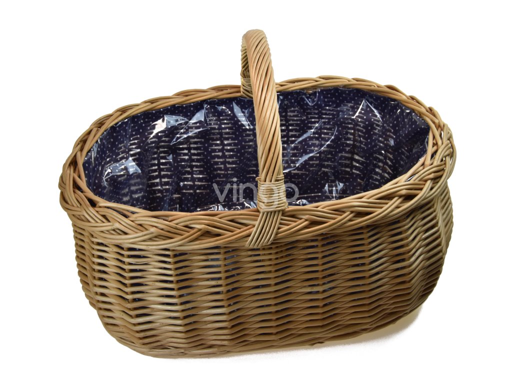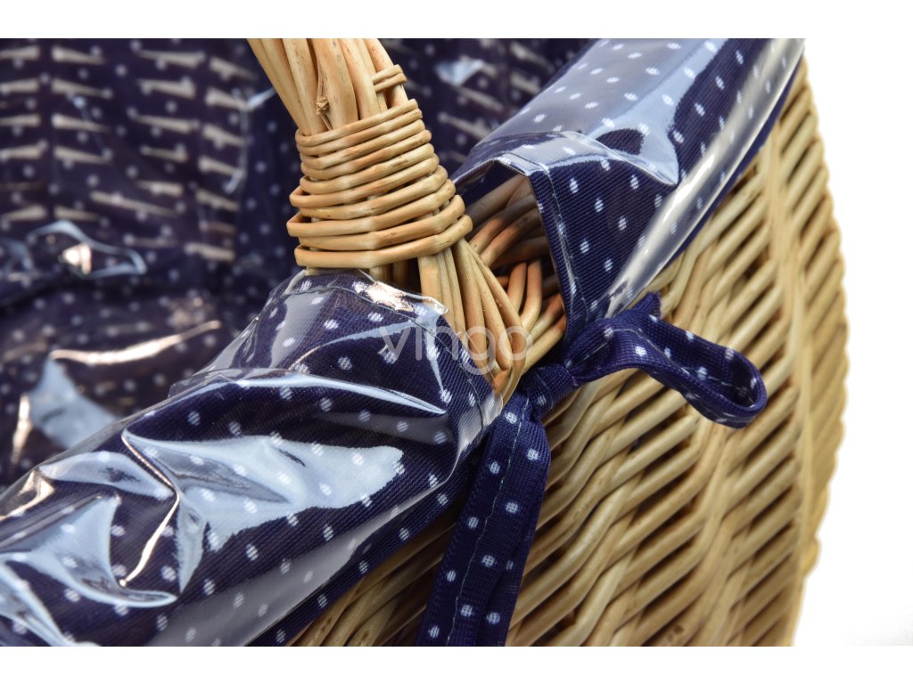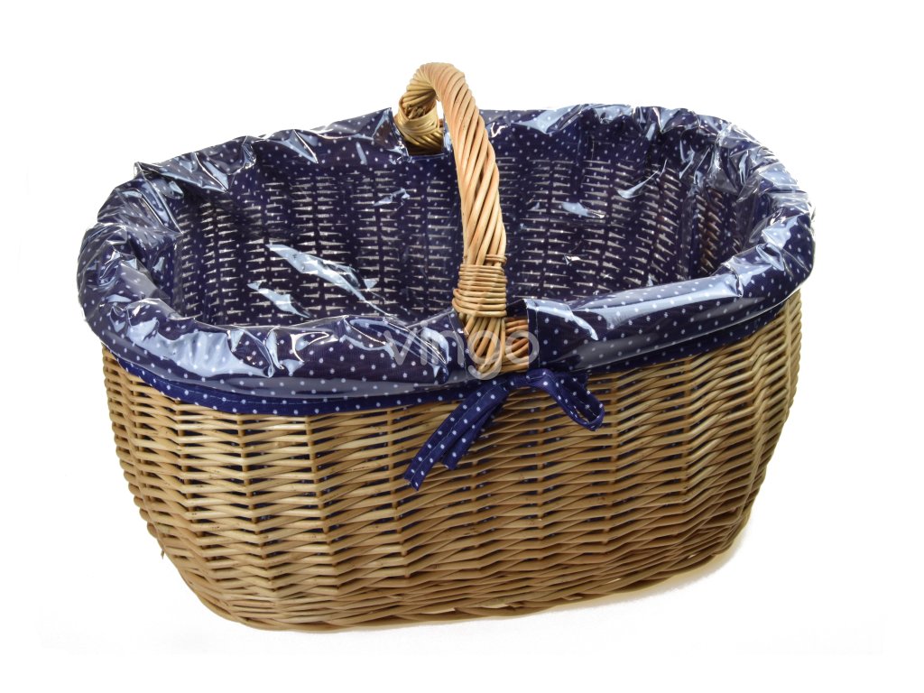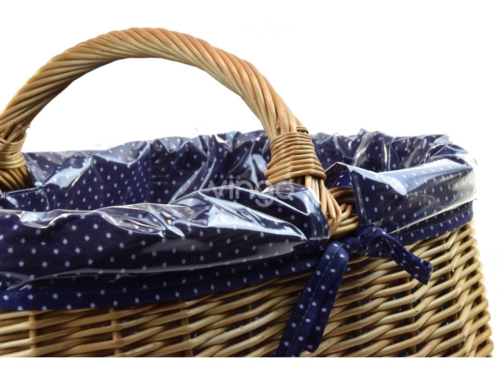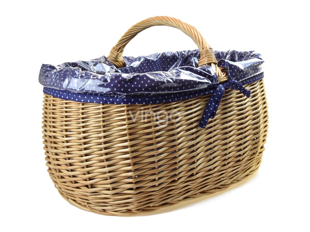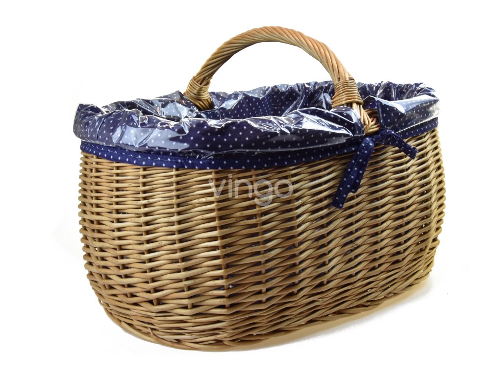Szeretsz nyáron termelői piacokra járni? Nem akarsz műanyag zacskóban vásárolni? Vegyél egy hámozott fonott bevásárlókosarat. Ebben a kosárban kék színű, fehér pöttyös szövet található, amelyre műanyag betét van varrva. Így a földről nedves vagy piszkos zöldségeket is vásárolhat. A teljes betét kivehető a kosárból, masnikkal rögzíthető. A kosár nagy fogantyúval rendelkezik a könnyű hordozhatóság érdekében.Termékinformáció: