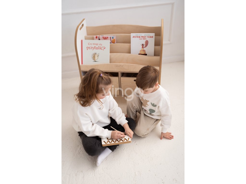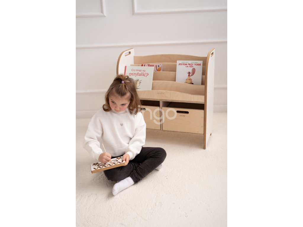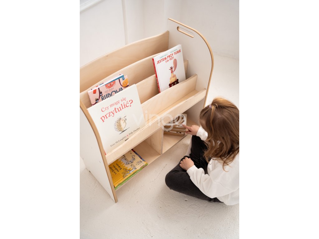 - Önállóságot támogat: Ez a polc Montessori elvek alapján készült, hogy a gyerekek könnyedén elérhessék a könyveket és játékokat, tanulják meg az önálló választást, ezáltal fejlesztve szervezési képességeiket és önállóságukat.