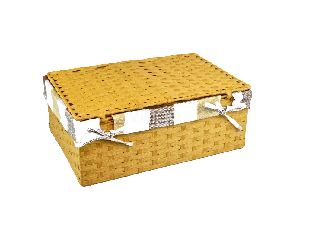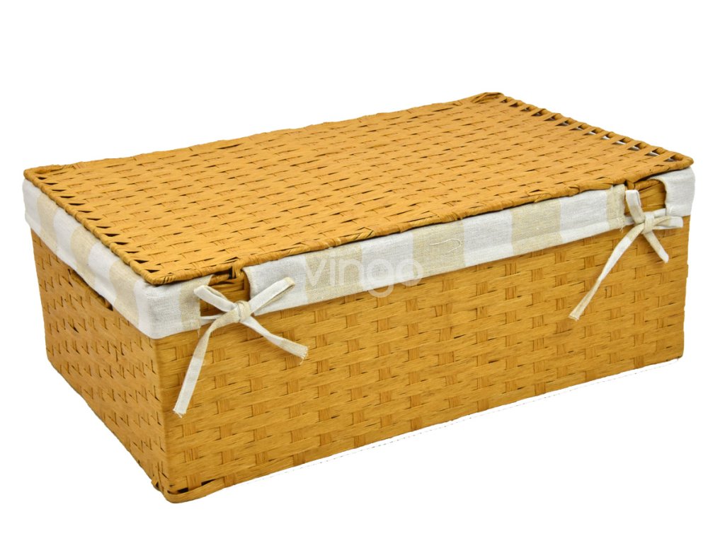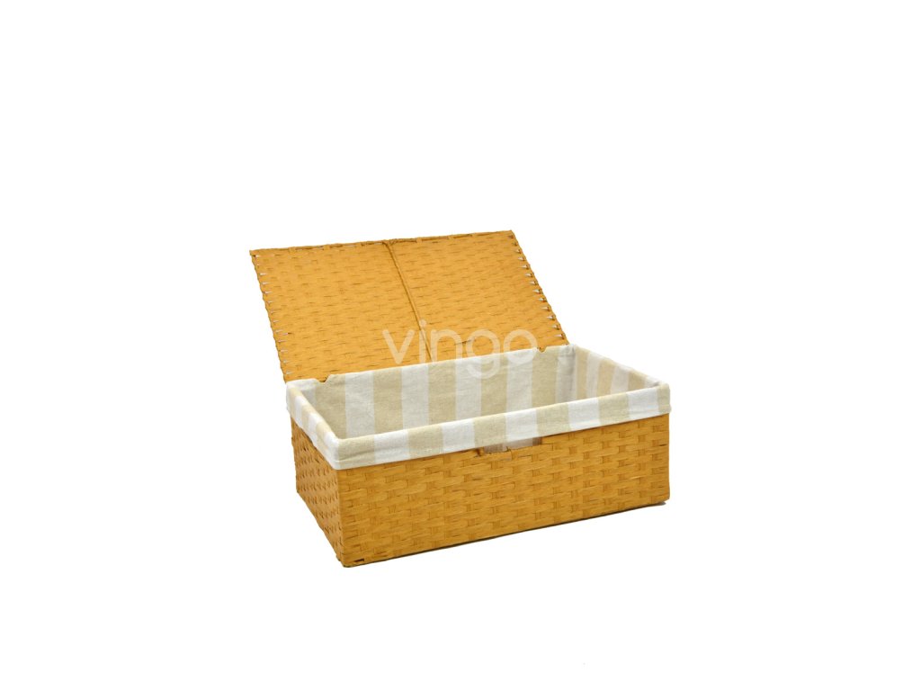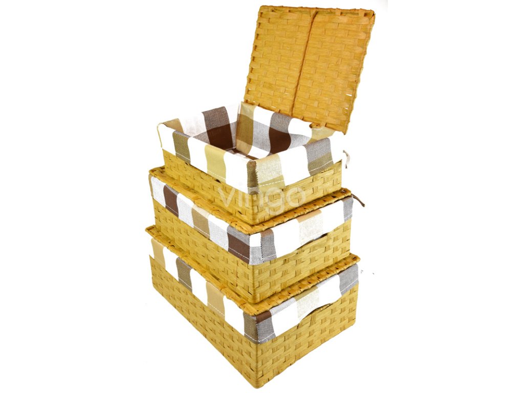 - Mosható szövettel: A dobozok belsejében szövet van, amely masnikkal van rögzítve. A barna-fehér csíkos anyag levehető és mosható.