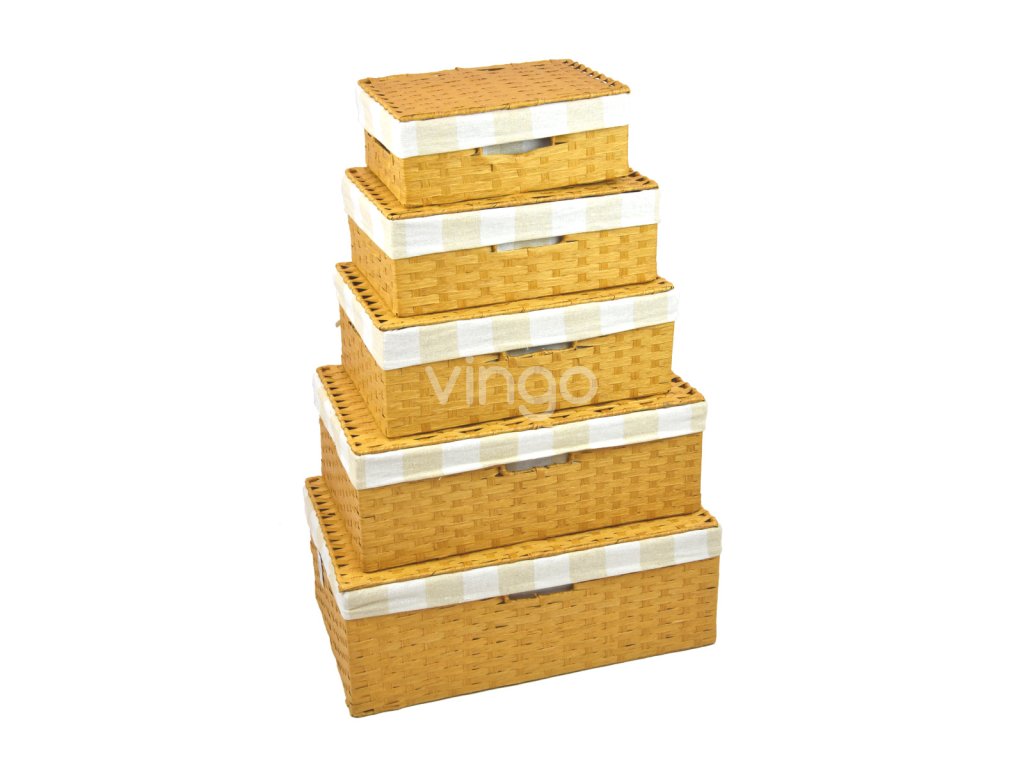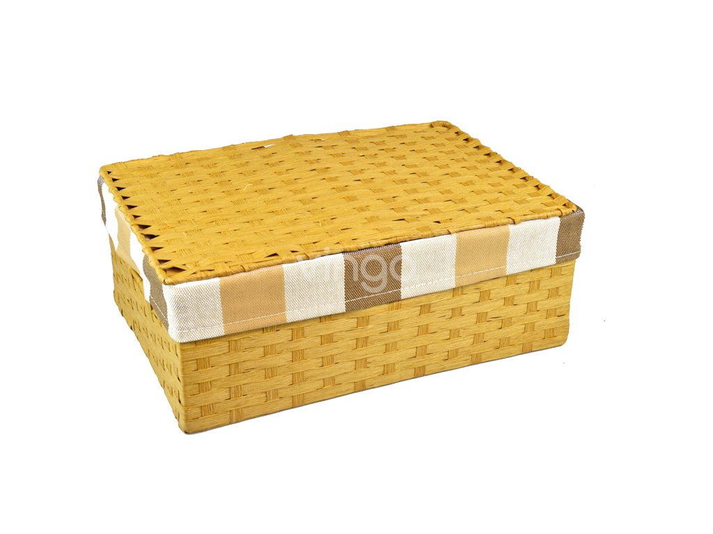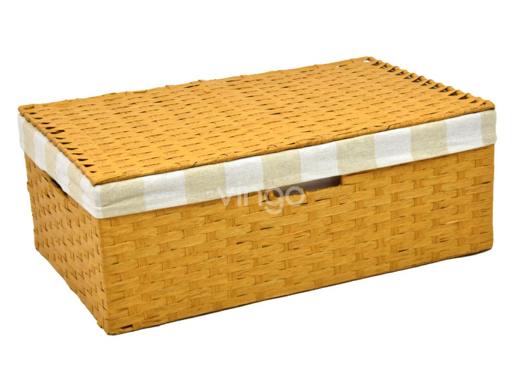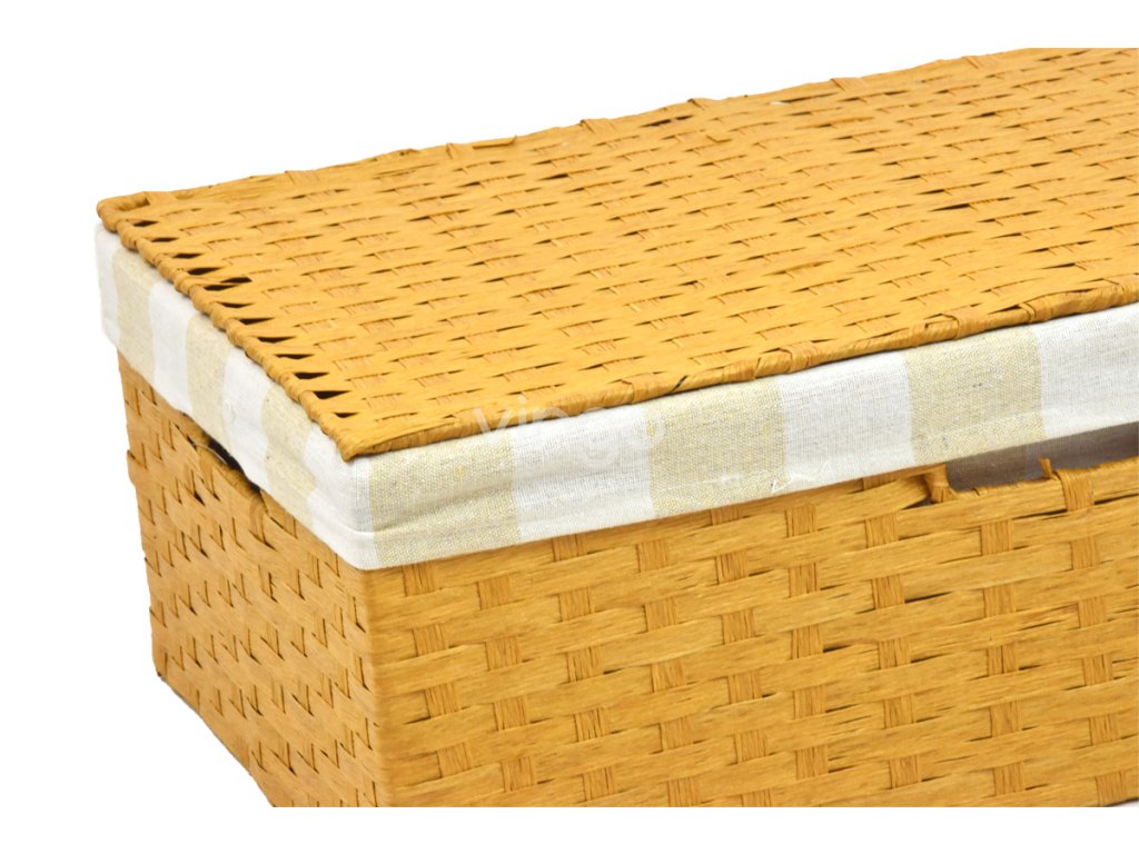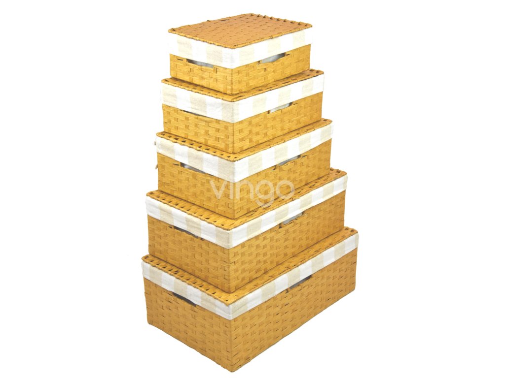 - Mosható szövettel: A dobozok belsejében szövet van, amely masnikkal van rögzítve. A barna-fehér csíkos anyag levehető és mosható.