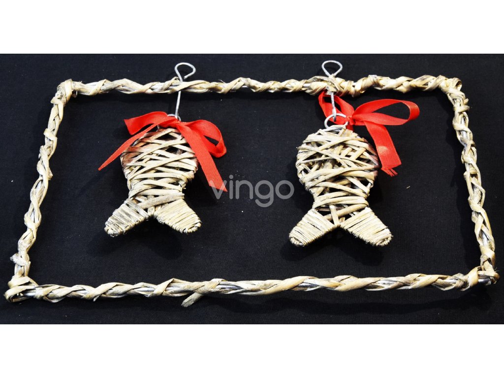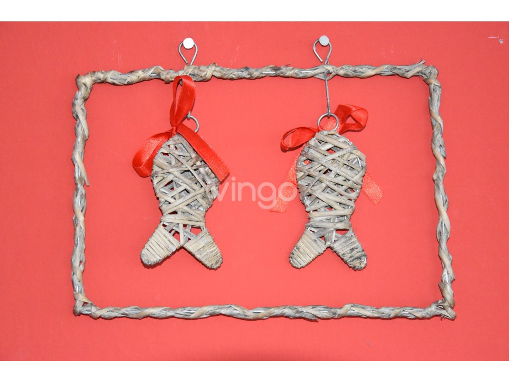 A fonott keret, amelyben két fonott hal van akasztva, két fűzőlyukkal rendelkezik a könnyű felakasztás érdekében. Karácsonyi díszek ajtókra, ablakokra és falakra. Mind a váz, mind a halak drótszerkezetűek, a halakat piros masni díszíti, amit könnyedén cserélhetsz otthonodhoz jobban illő színre. A fonott karácsonyi dekoráció szürke színű. Gyönyörű karácsonyi ajándéknak is megfelelő.Termékinformáció: