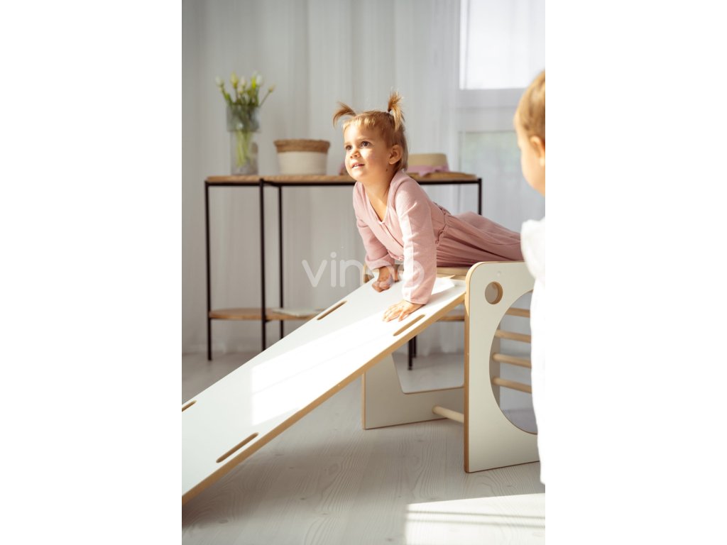 - Kétoldalú: Az egyik oldalon fogantyúk találhatók a könnyű mászáshoz, ami erősíti az izmokat és fejleszti a gyermek motoros képességeit, míg a másik oldalon sima felület van, amely csúszdaként szolgál a biztonságos lecsúszáshoz, ami végtelen örömet nyújt a mozgásban.