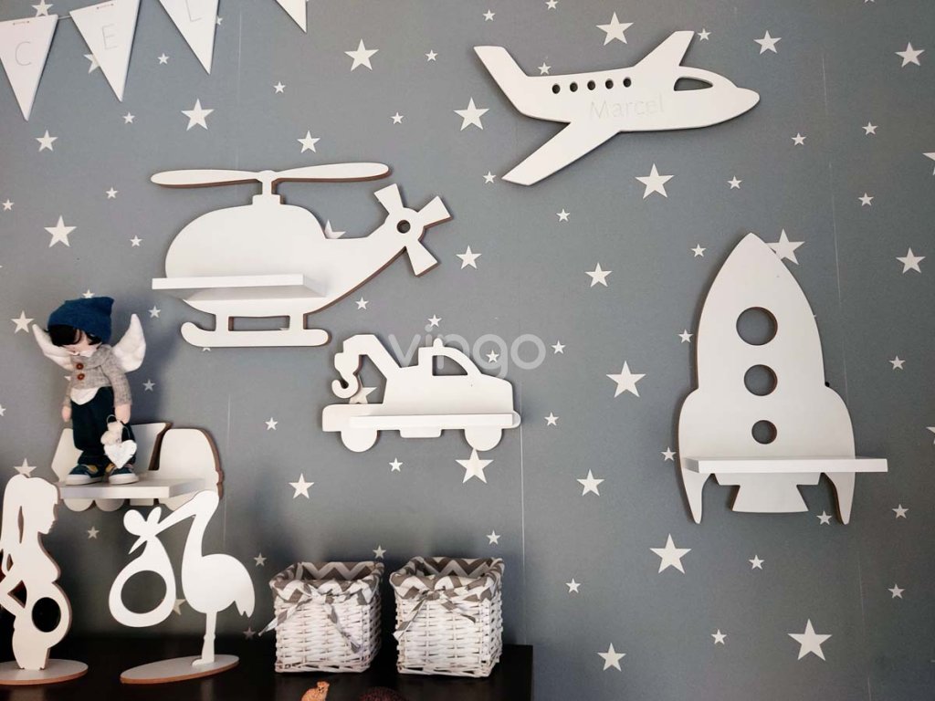 - Praktikus dekoráció. Ideális azoknak a gyerekeknek, akik szeretik a teret, beleértve a rakétákat és más űrjárműveket. Tökéletesen illeszkedik egy modern design helyiségbe, mint polc játékok tárolására, fényképek és képek megjelenítésére. Használható éjjeliszekrénynek az ágy mellett. A gyerekek értékelni fogják azokat a darabokat, amelyek csak az övék!