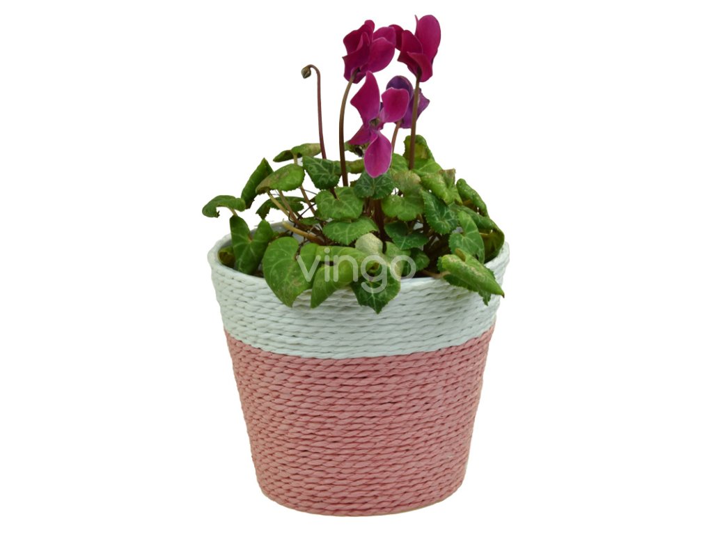 A fehér és rózsaszín kombinációjú zsinóros virágtartó gyönyörű, gyengéd kiegészítője lesz otthonának. A belső műanyag betétnek köszönhetően nagyon praktikus is. Melyik virágot ültessétek bele?Termékinformáció:
