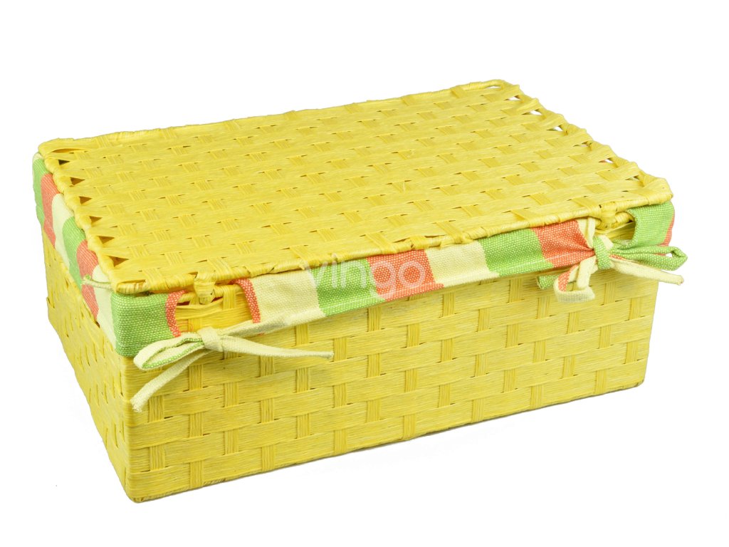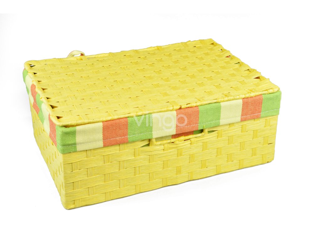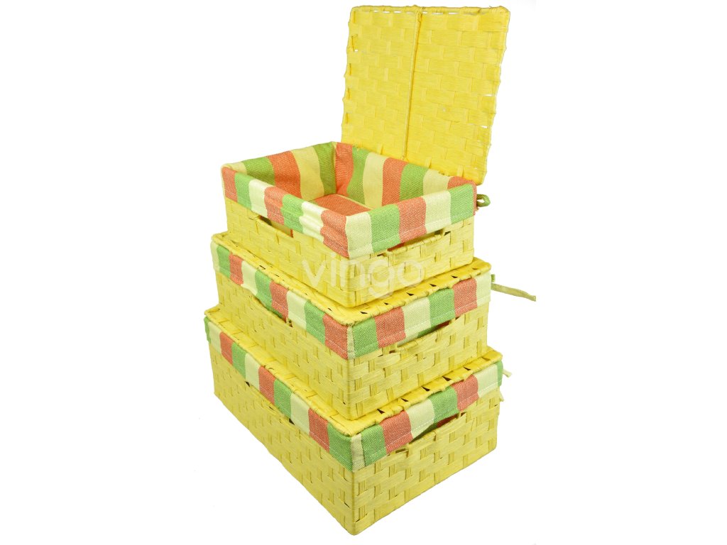- Mosható szövettel: A ládák mosható anyaggal béleltek és csíkos mintával sárga-narancs-zöld színben.